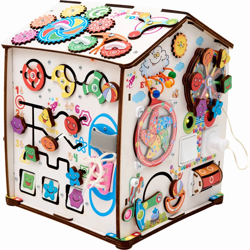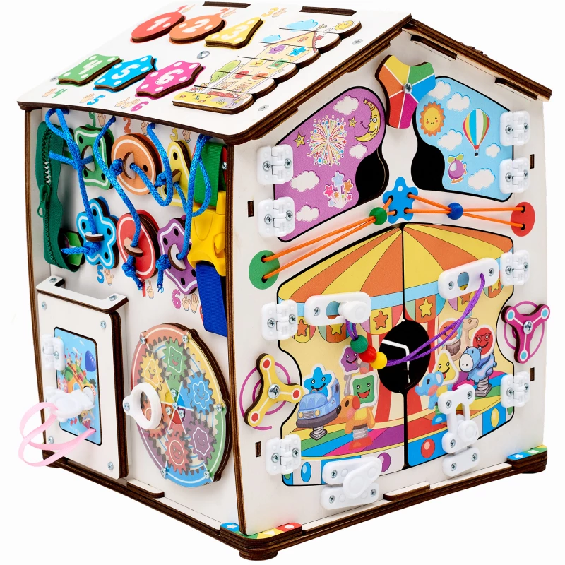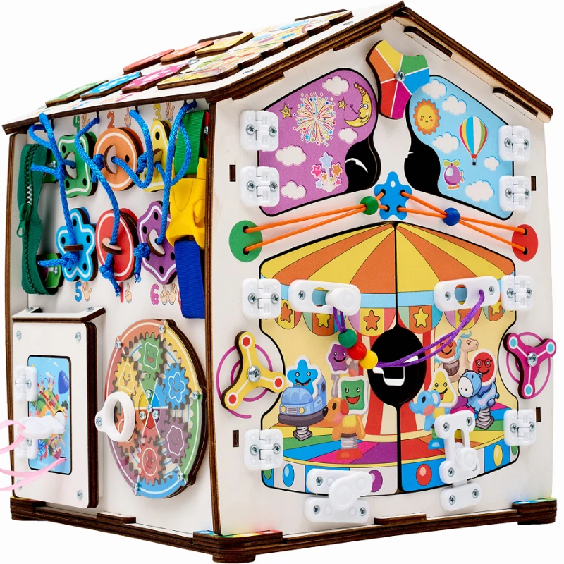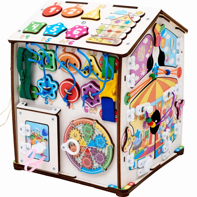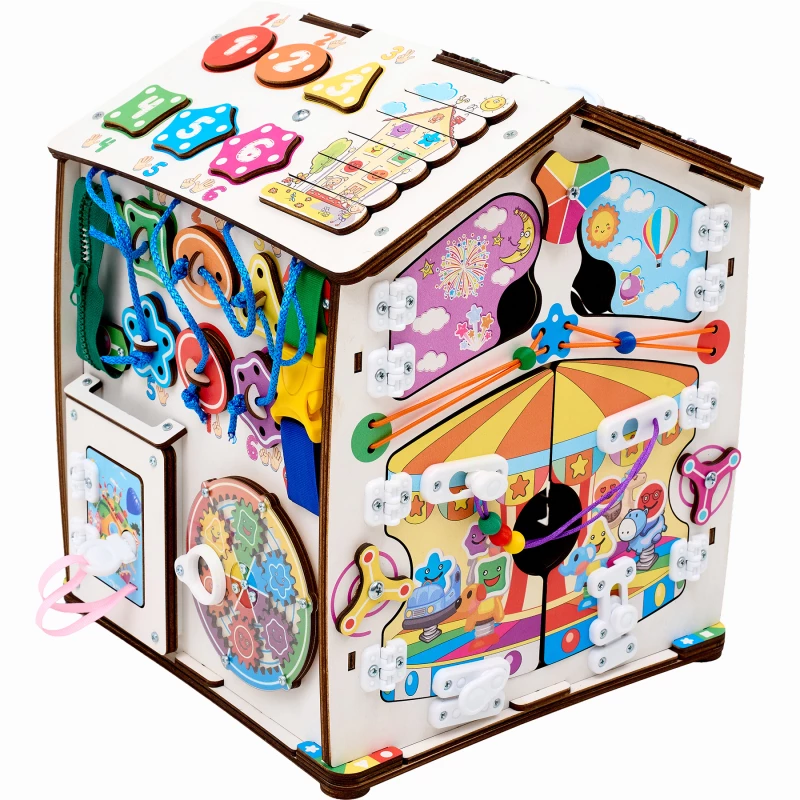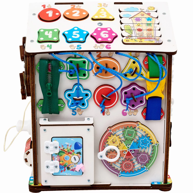 Также на игровых полях есть классические игры – лабиринты, сортеры, шнуровка, дверцы с замками. С их помощью ребенок учится считать, запоминает название геометрических фигур и становится более самостоятельным.