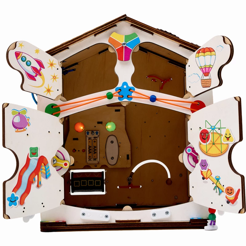 На этом красочном тематическом бизиборде собрано много оригинальных развивающих игр. Среди них есть круг-карусель с бисером, яркие спиннеры, трещотки, сателлит с удобной ручкой, «Рогатка». Эти элементы стимулируют межполушарное развитие мозга и укрепляют пальчики.