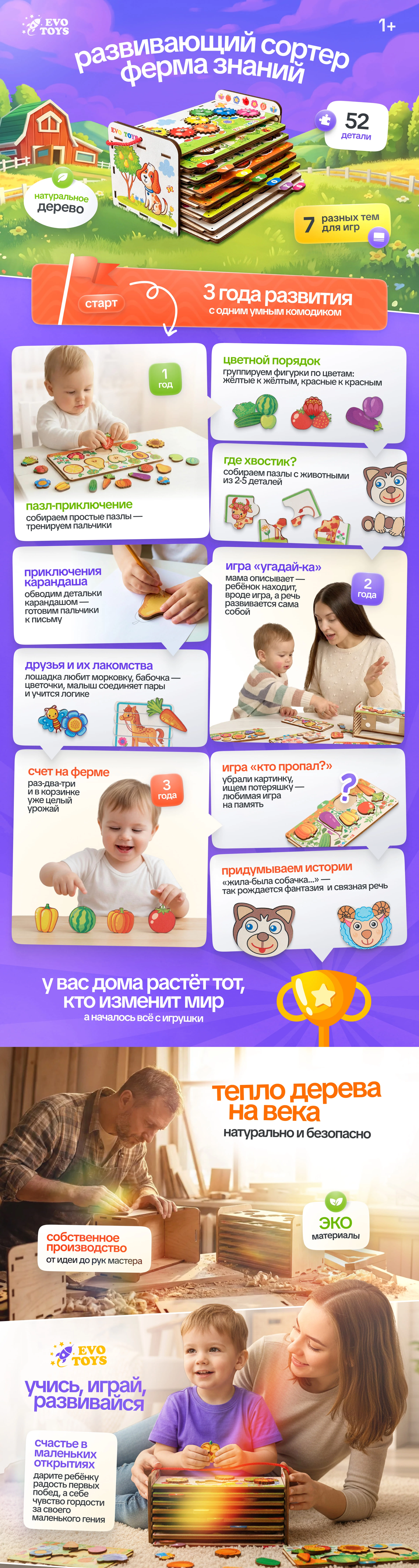 Сортер развивающий Умный комодик - На ферме, фигуры вкладыши